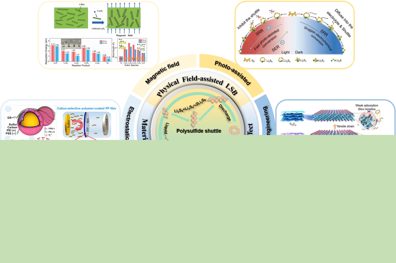 高理論能量密度鋰硫電池(LSB)的發展一直受到多硫化鋰(LPS)的穿梭效應和緩慢硫還原/氧化反應動力學的制約。近年來,基于物理場效應緩解穿梭效應并增強反應動力學的合理設計得到了廣泛的研究,對硫物質的相互作用提供了更本質的見解。該文聚焦物理場效應,系統總結了LPS相互作用的方法和機制。具體而言,介紹了LSB系統的工作原理、穿梭效應的起源以及LSB系統中的動力學問題。然后,闡述了基于物理場效應概念的LSB相關材料的設計機制和應用,以及外部物理場輔助增強的LSB,對包括靜電力、內置電場、自旋狀態調節、應變工程、外部磁場、光輔助等策略進行了詳細地闡述和討論。最后,總結并展望了這些策略在提高LSB性能和減弱穿梭效應方面的潛在方向和見解。