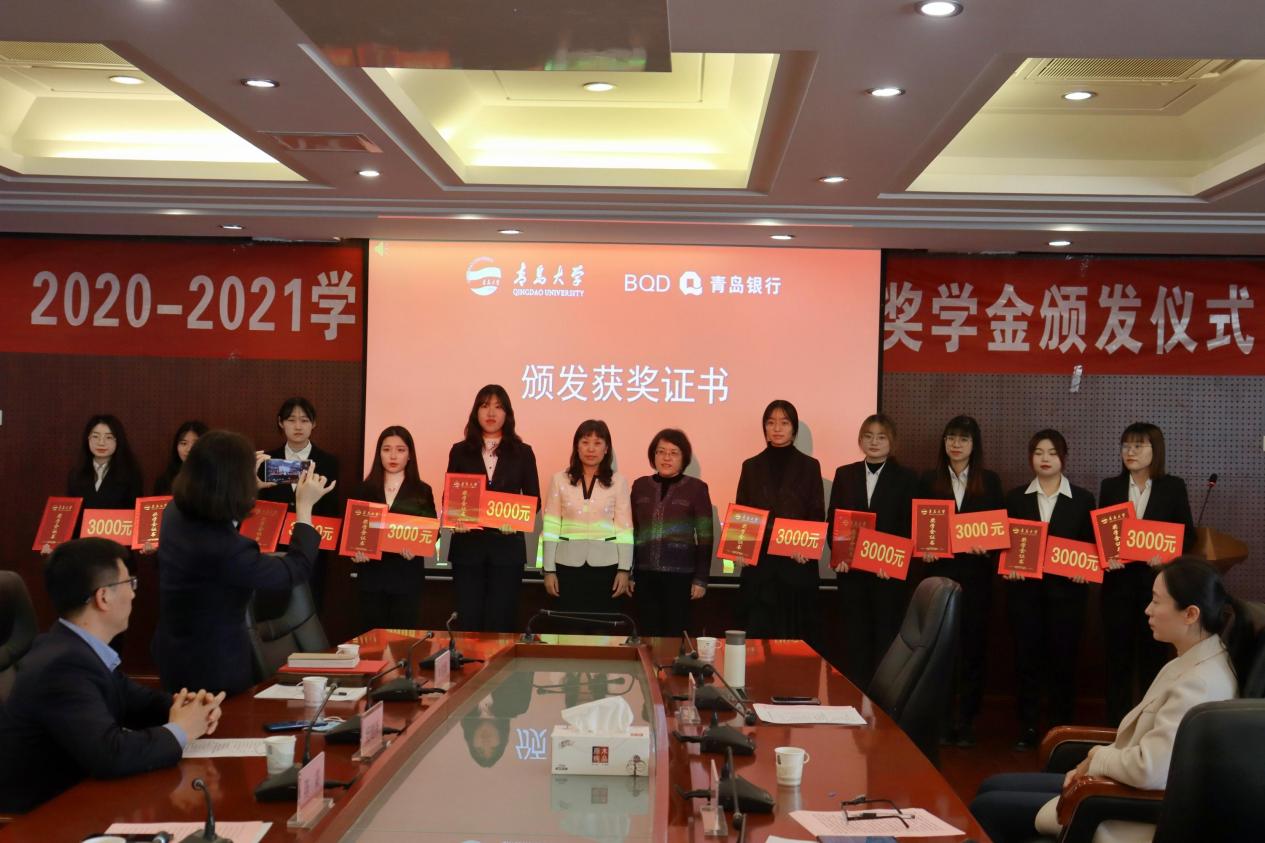 新聞網訊 12月17日下午,2020-2021學年“青島大學-青島銀行獎學金”頒發儀式在我校第一會議室舉行。校黨委常委、副校長劉彩云,青島銀行副行長陳霜出席頒發儀式并講話。