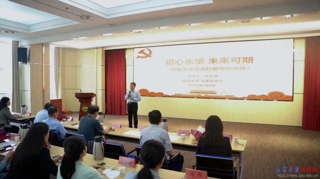 杜方波以“初心永摯 未來可期”為題為2022屆畢業生黨員講授“畢業一課”。杜方波以毛澤東主席的《為人民服務》一文為切入點,從思想、踐行、奉獻三個層面對“黨員”進行解讀。在思想層面,杜方波叮囑同學們要有理想,理想是指引自己的航標燈;在執行層面,要積極執行黨的決定,遵守黨的紀律;在奉獻層面,要對社會、對別人有所奉獻。杜方波寄語畢業生黨員三句話,一是‘修一顆善良的心’,二是‘培養過硬的本領’,三是‘用一生的時間讀透一本書’,希望畢業生黨員修養品德、歷練才能、終身學習。