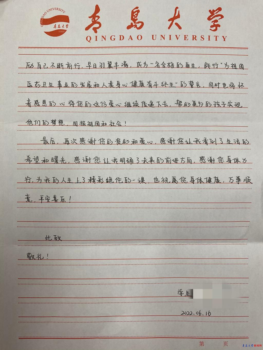 90歲高齡的趙老先生依然身體健朗。他曾是一名軍隊醫務人員,平時生活很節儉,始終保持著在部隊上勤儉節約的作風、醫務工作者的情懷。退休之后,趙老先生一直有意資助一名家庭經濟困難且努力上進的醫學生。2017年冬天,趙老先生走進了青島大學,了解到該受助學生的情況,從此便開始了他默默無聞的資助之路。這一捐就是五年,迄今捐贈資金累計兩萬余元。五年來,趙老先生無論身居何處,無畏高齡和身體,堅持親自到學校捐贈資金。2021年,考慮到受助學生面臨畢業等因素,趙老先生主動提出并增加了部分捐贈額度。雖然此前趙老先生的家人并不知情,但近日他們了解情況后表示,趙老先生一直樂善好施,令人尊重,對于趙老先生多年的捐贈舉動,他們并不感到驚訝,也給予充分的理解和支持。