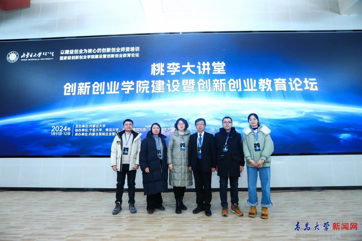 線下論壇于2024年1月10日-12日在內蒙古大學創新創業教育中心舉行,我校創新創業學院常務副院長王海榮帶領教師代表一行5人參加。王海榮做了題為“基于現代化背景下的地方綜合性高校創新創業教育改革探索”的工作匯報,從《深度融入:“五育+雙創”全方位育人》到《遞進挖潛:“教-訓-賽-孵”全鏈條實踐》再到《共生耦合:內外資源全要素生態》三個方面,總結了青島大學創新創業教育的內涵式建設經驗和做法,現場匯報理念與實例并存、數據與方法共用,獲得在場嘉賓的熱烈掌聲。在創新創業教育對話環節,我校秦文婷從“做實”、“順勢”兩個方面用三個生動的實例分享了創新創業課程建設思路和方法,提出雙創工作者要“保持初心、抬頭望遠”,用雙創思維來做雙創教育,得到了與會人員的贊同。