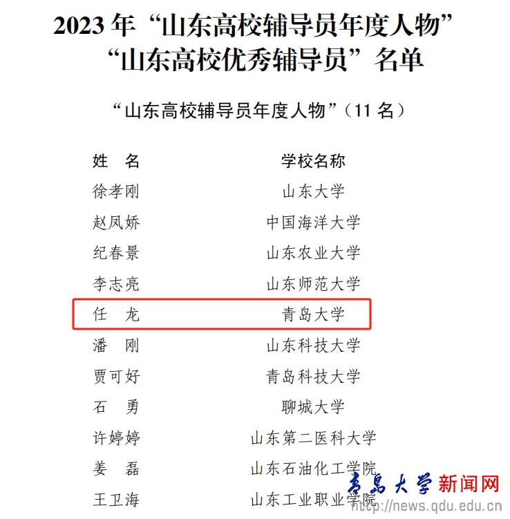 新聞網訊 近日,中共山東省委教育工委公布了2023年“山東高校輔導員年度人物”“山東高校優秀輔導員”評選結果,我校輔導員任龍獲評2023年“山東高校輔導員年度人物”榮譽稱號。